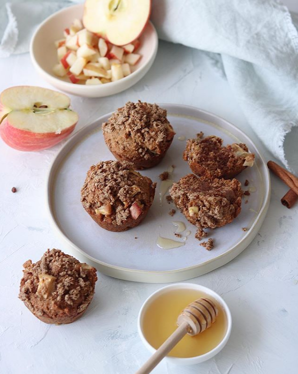 In another bowl beat egg and mix in remaining ingredients for the muffins, except the chopped apple.
