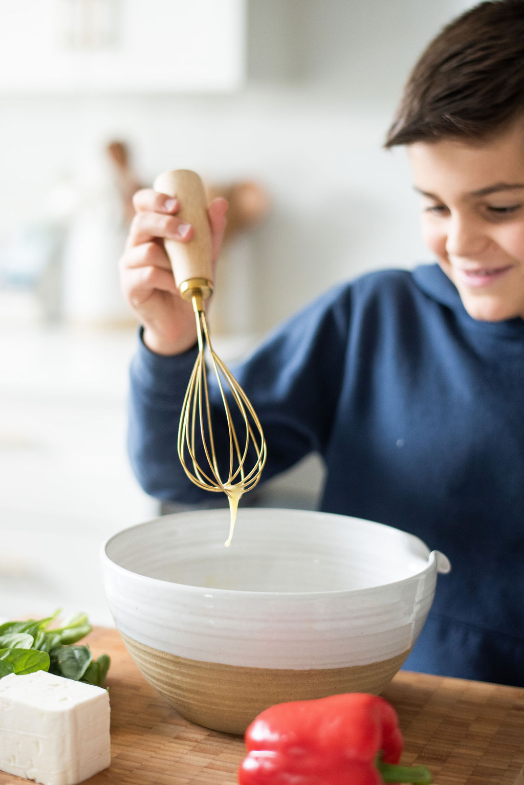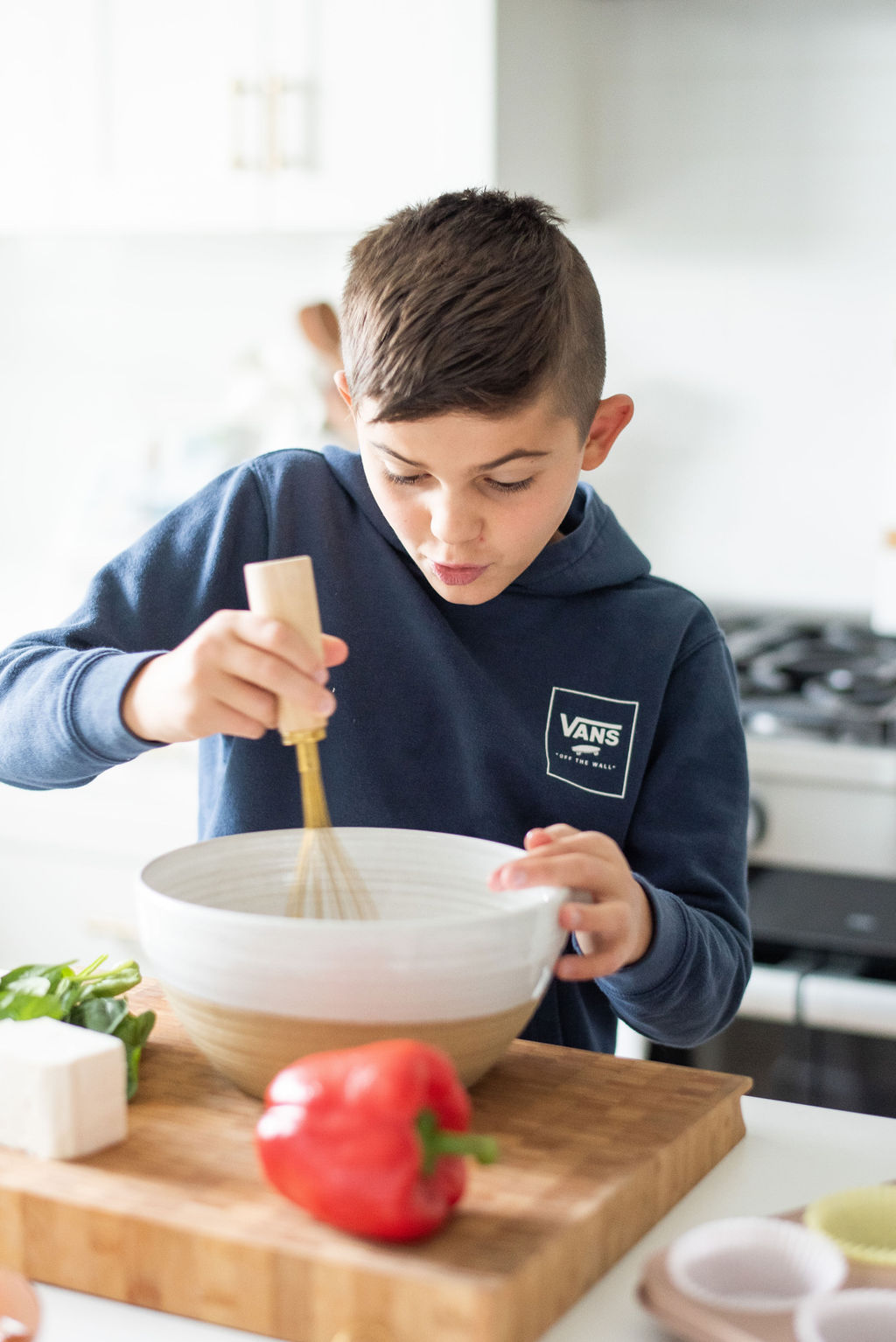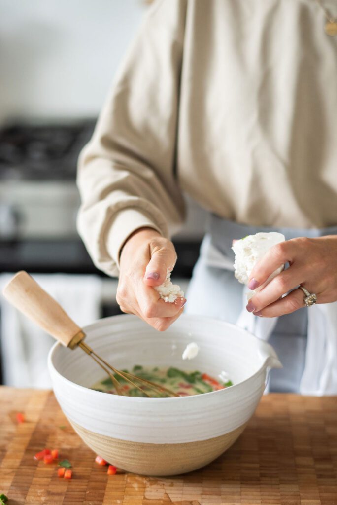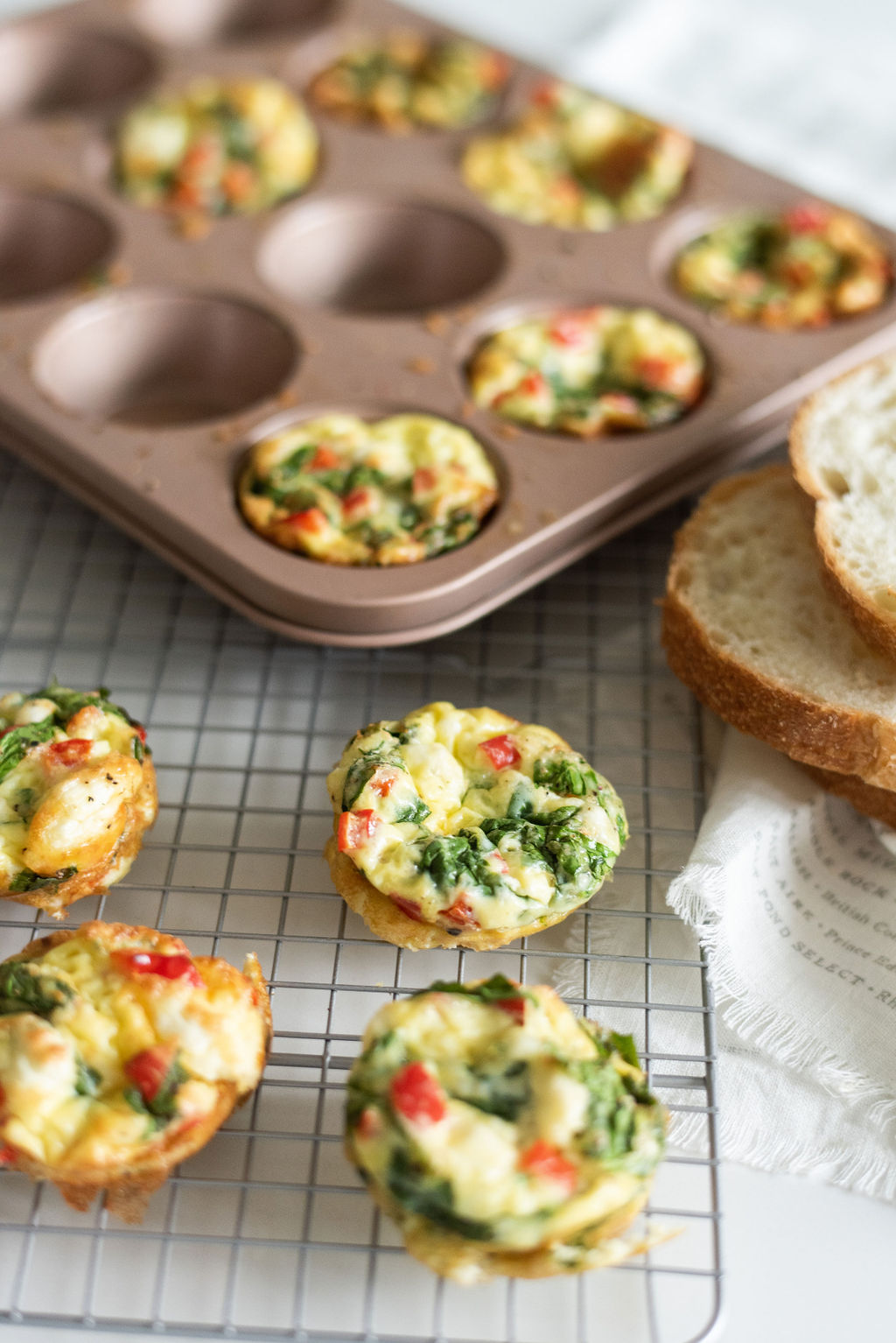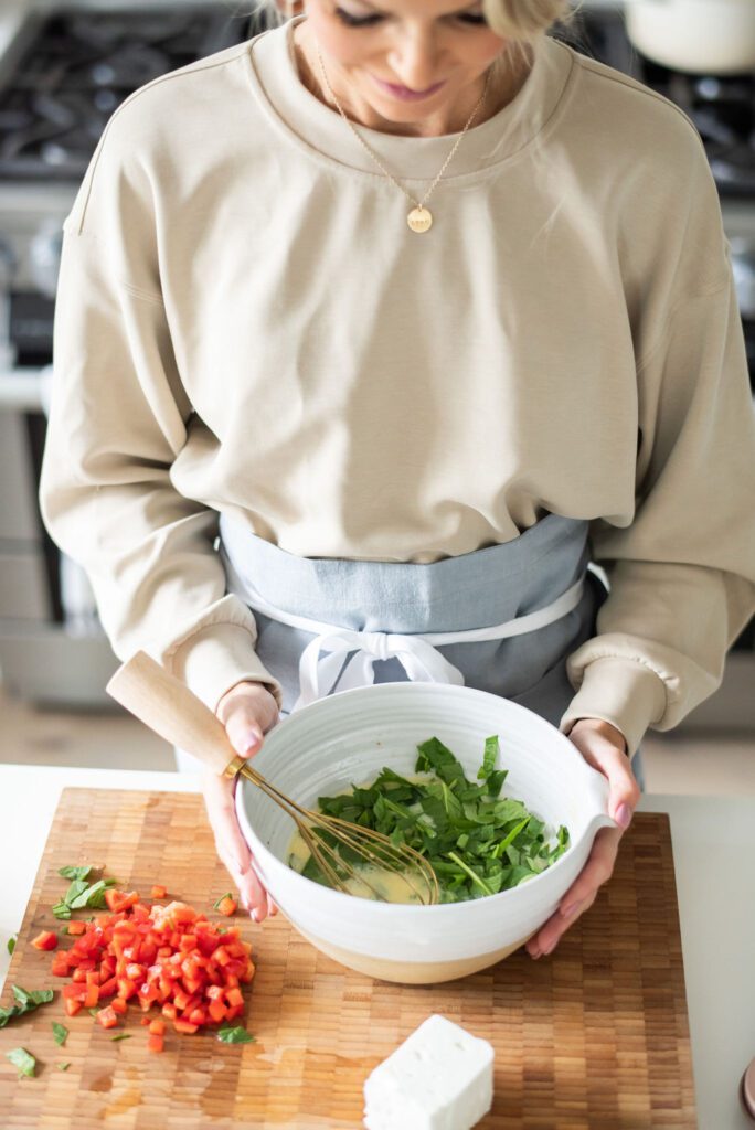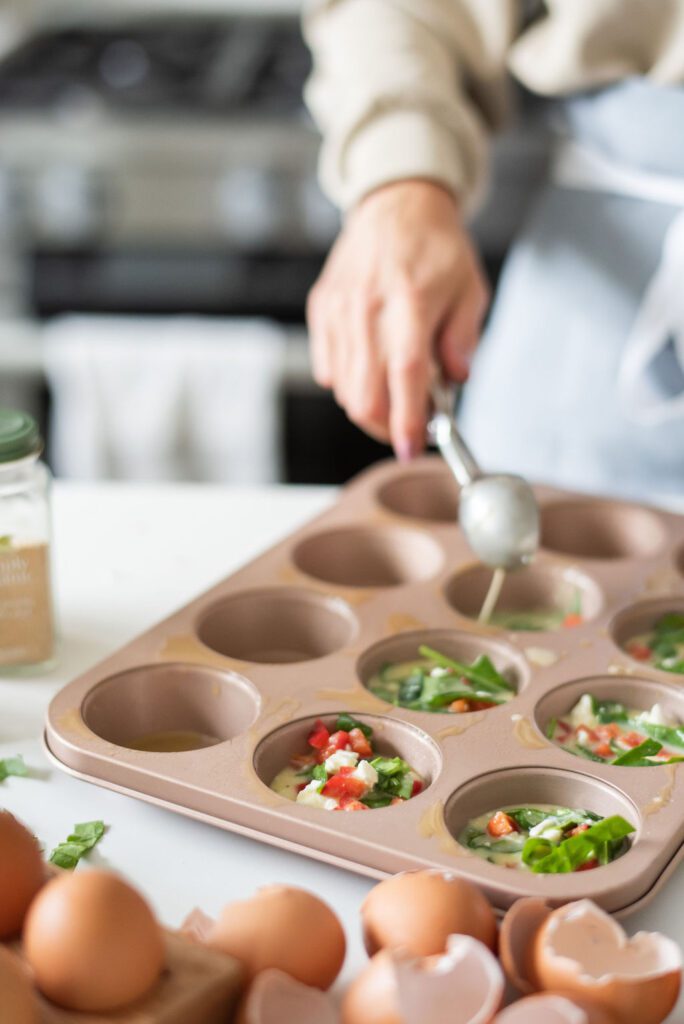 03. Add the spinach, bell pepper and crumbled feta cheese and evenly distribute among the muffin cups. Pour the egg mixture over the veggies, filling each cup about three-fourths full. The eggs will rise so avoid filling them all the way.