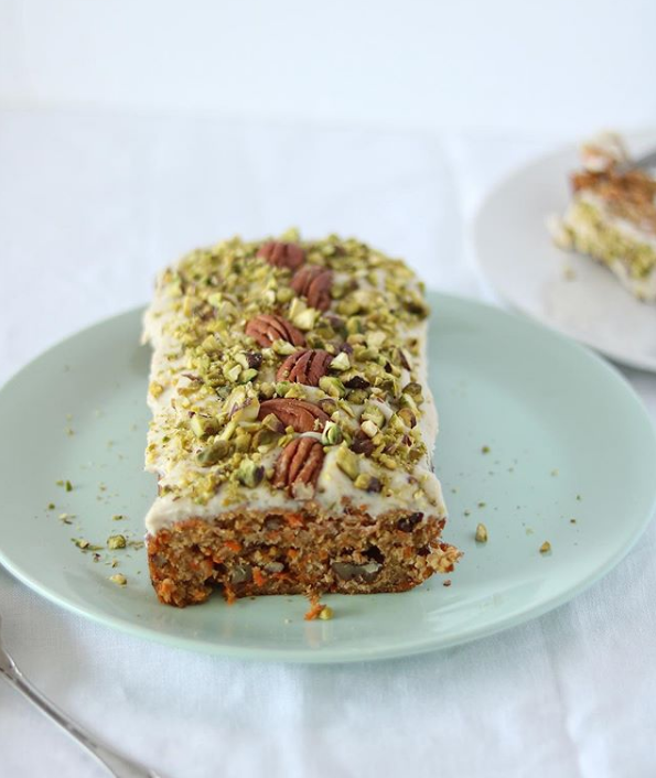 Allow the loaf to cool for at least an hour. Once cool, spoon the frosting on top. Sprinkle with chopped pistachio and walnuts, and enjoy!
