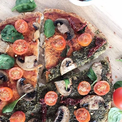 09. Once the crust is firm and dry, add your favorite pizza toppings and return to the oven briefly to let everything heat up, about 10-15 additional minutes. I added marinara sauce for one half and pesto sauce for the other half, along with sauté mushroom, fresh spinach, basil, fresh tomato, sundried tomato.