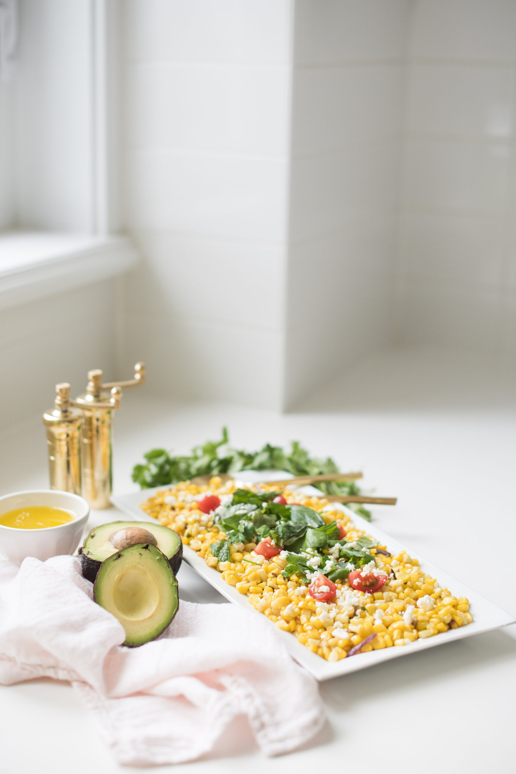 04. Transfer the corn to a serving plate. Add the diced avocados, cherry tomatoes, mint and basil, and drizzle in the lime vinaigrette, a few teaspoons at a time. Toss and taste for seasoning.