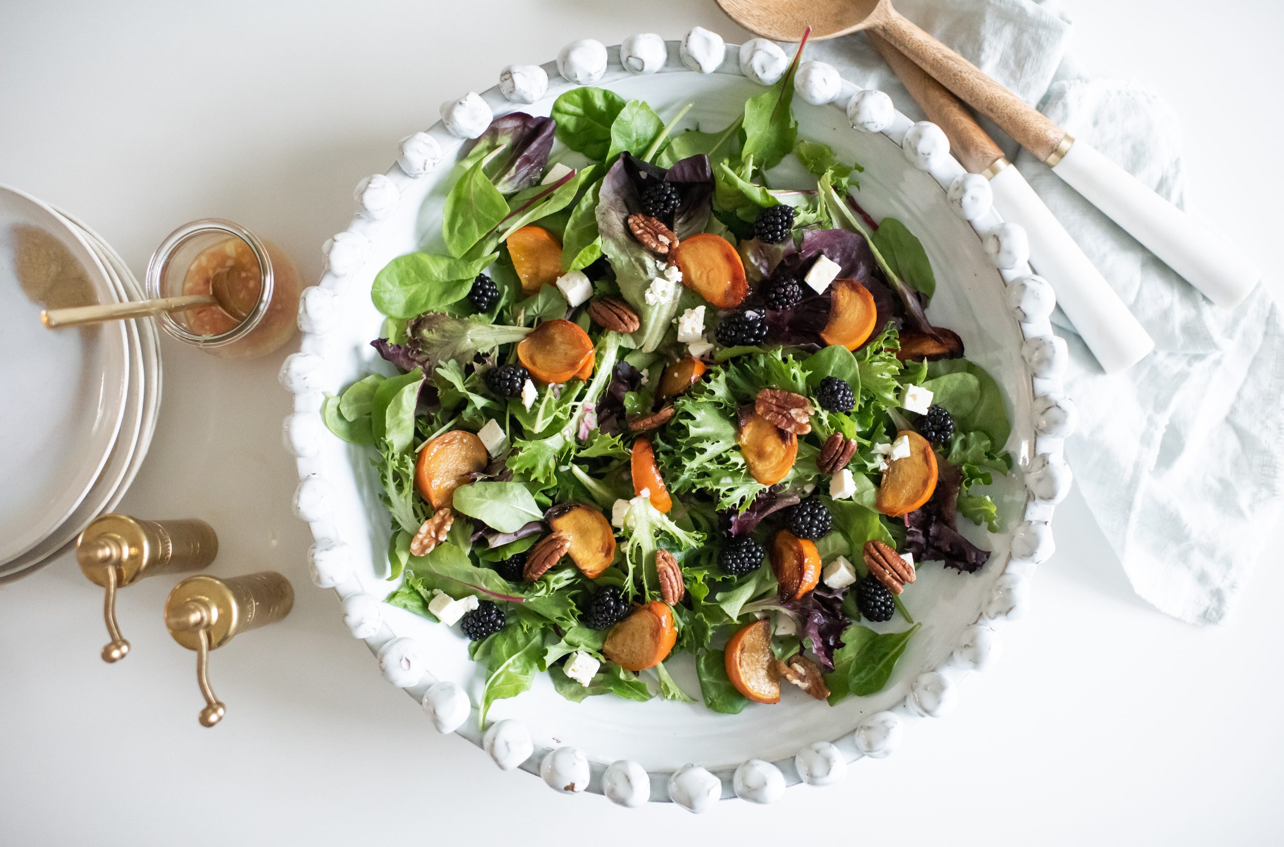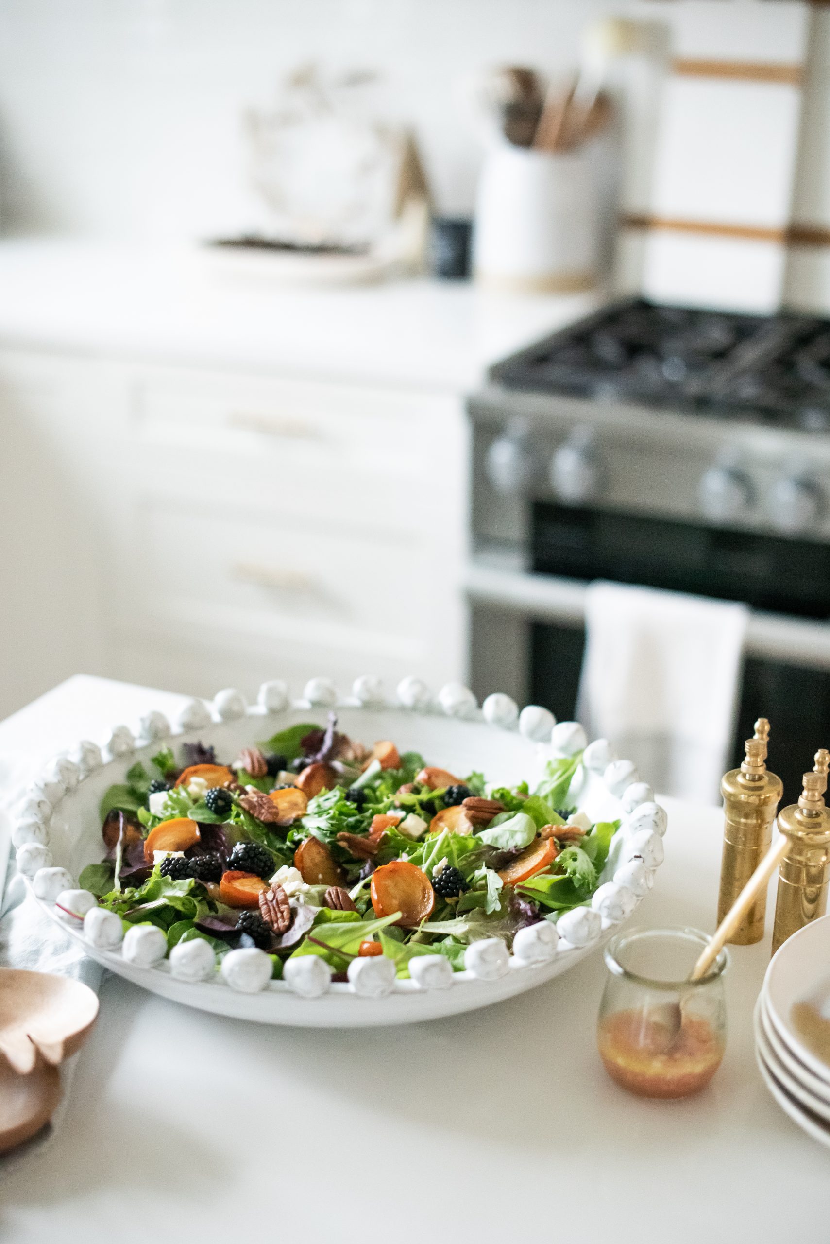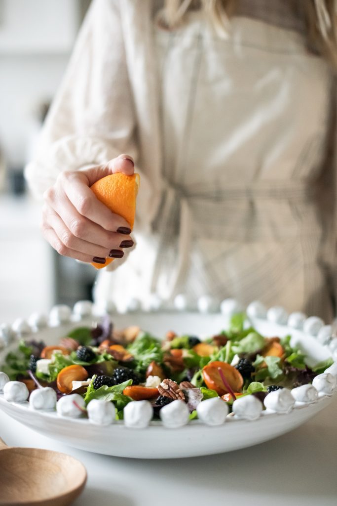 Every dinner needs a green salad! Ok, that’s just my opinion, and wait maybe not EVERY dinner, but certainly one where you are pulling out all the stops and making a feast. As part of a traditional Italian family, the salad is always eaten at the END of the meal, almost like a palette cleanser, even though I grew up eating it as part of the dinner, I have grown fond of these traditional ways and actually quite enjoy it. No matter when you eat your salad, this one is all about the festive and bright fresh flavours. The vinaigrette is a personal favourite as I LOVE citrus especially with a generous drizzle of honey. I suggested a combination of oranges, pomegranates, blackberries and dried cranberries, but of course you can change that up to what ever is available or what your preference may be. Either way, I know this salad will become a favourite all year long.