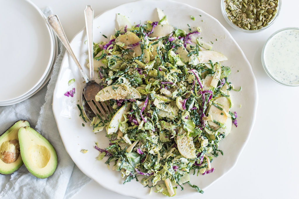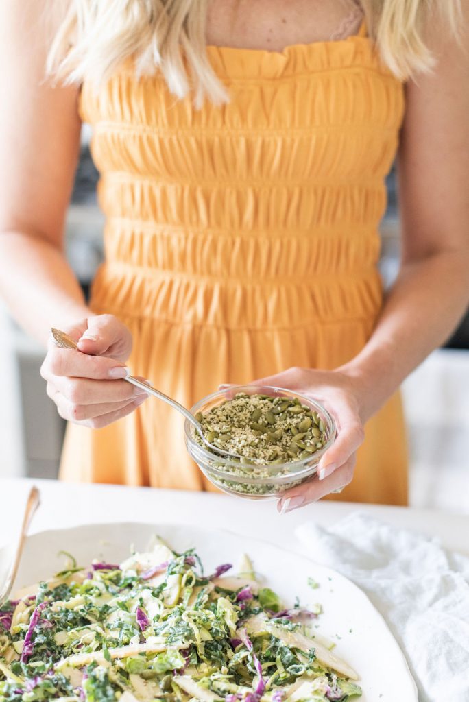 01. SLAW. In a large mixing bowl combine all the slaw ingredients except the avocado, pumpkin seeds, and hemp seeds. Set aside.