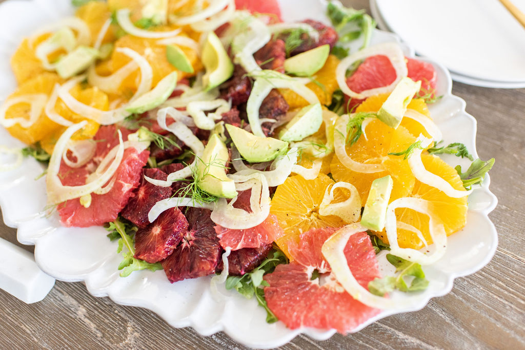 03. To plate the salad – line the bottom of a platter or large bowl with watercress. Artfully arrange layers of all other ingredients (oranges, fennel, onion, and avocado). Sprinkle with salt, pepper, and fennel fronds. In a small bowl, mix in the olive oil and honey and drizzle over the salad.