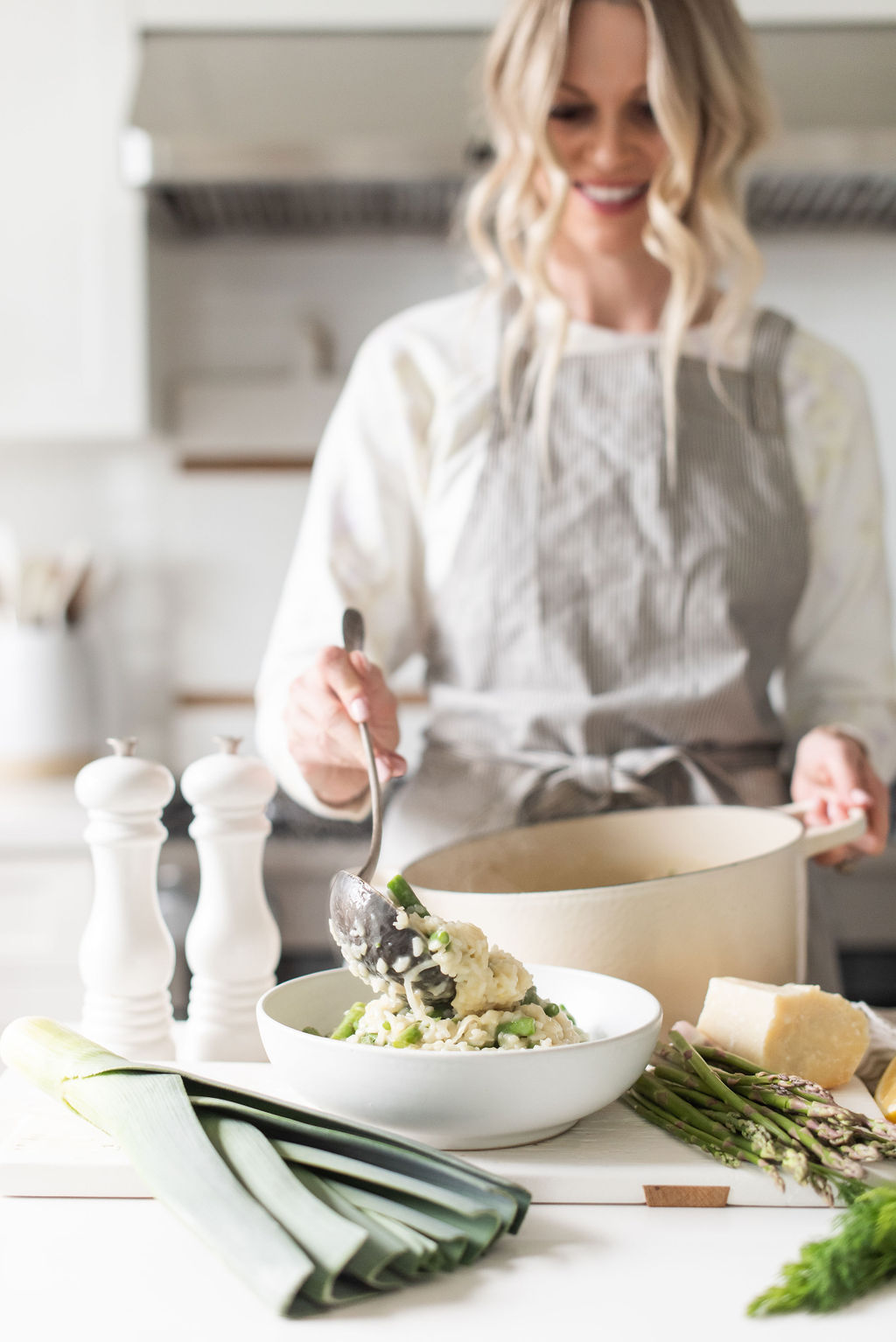 There are a few things that I feel have helped my risotto game. 1. The right pot- I love my 4.7 L Le Creuset Dutch Oven. It gives the perfect surface area, and is deep enough to really stir and combine the ingredients. If you are using another pan, make sure it is at least 10′ in diameter. 2. Keep the stock hot which also helps break down the rice, helping it to cook faster. 3. Have everything prepped and ready at the stove as you don’t want to leave the rice unattended. 4. Use arborio rice. I have tried other short-grain versions including carnaroli, but prefer the texture and finish when using arborio.