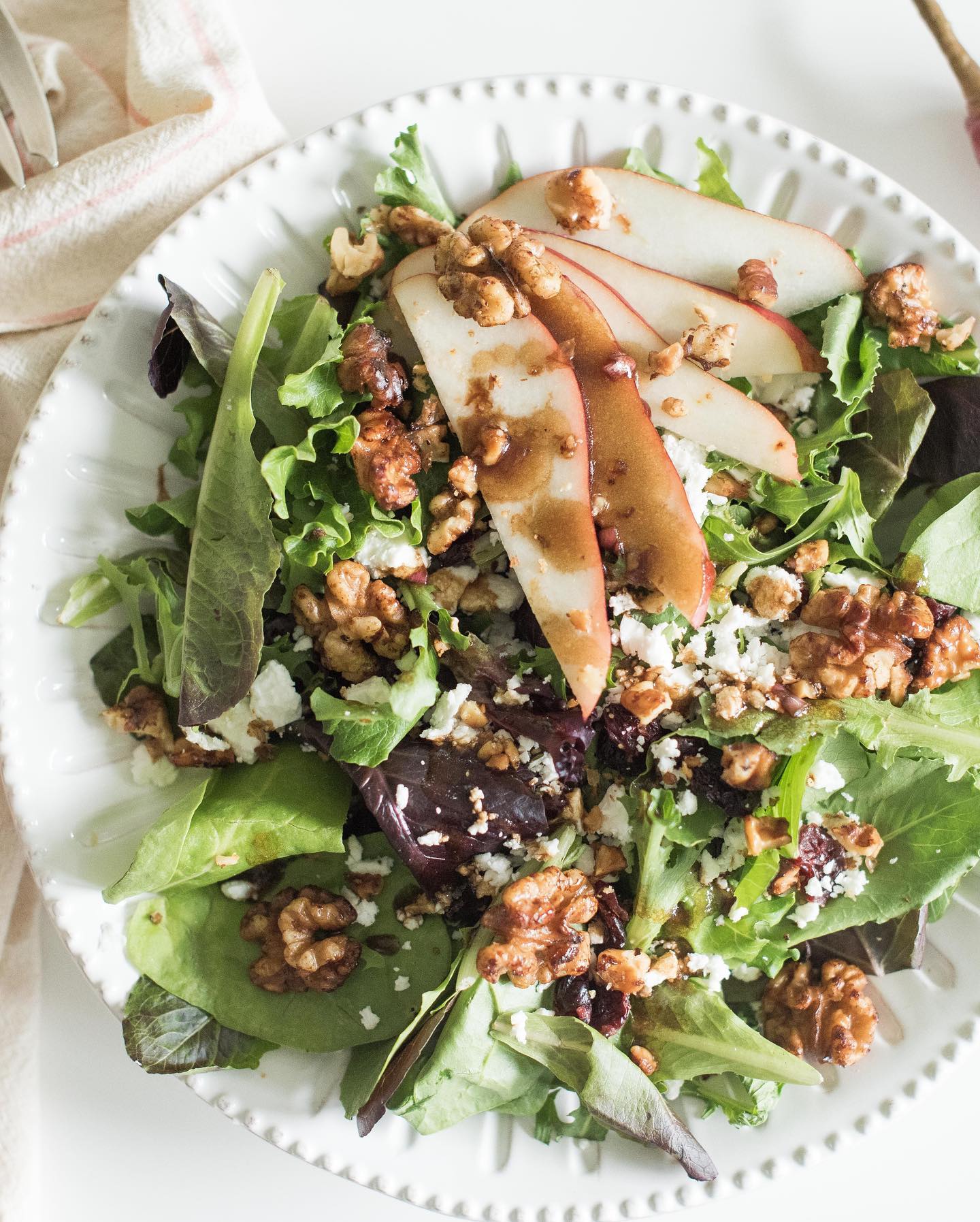 Love a simple salad with a bit of sweet crunch…this fall pear candied walnut salad with balsamic drizzle hits all the notes! I always mix a dressing at the beginning of the week as part of my prep. This one is so easy and matches with many different salad greens.
