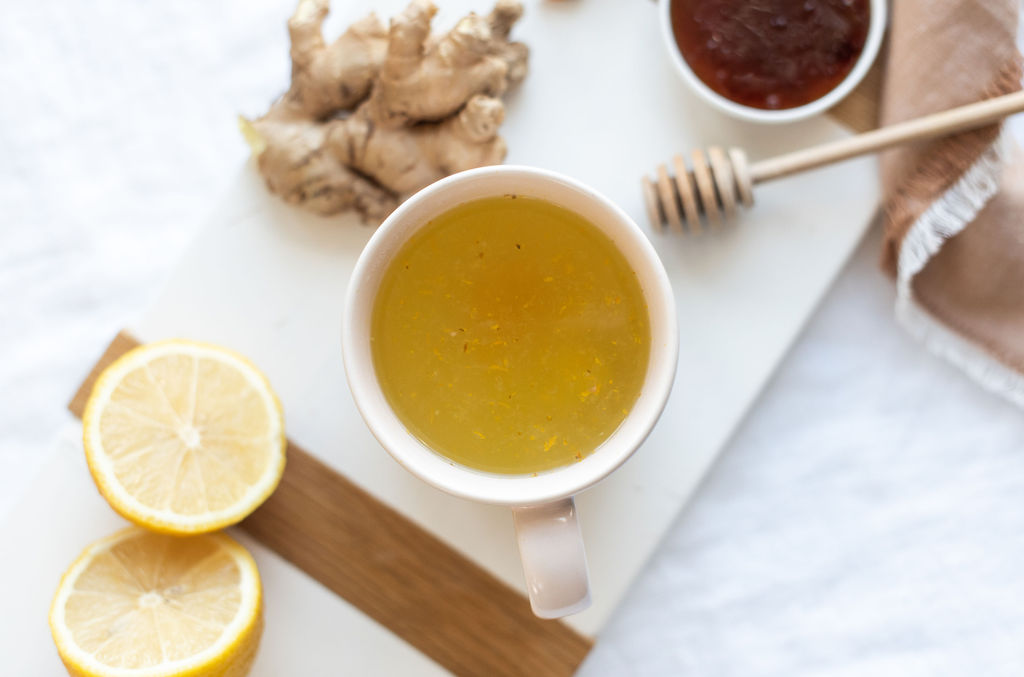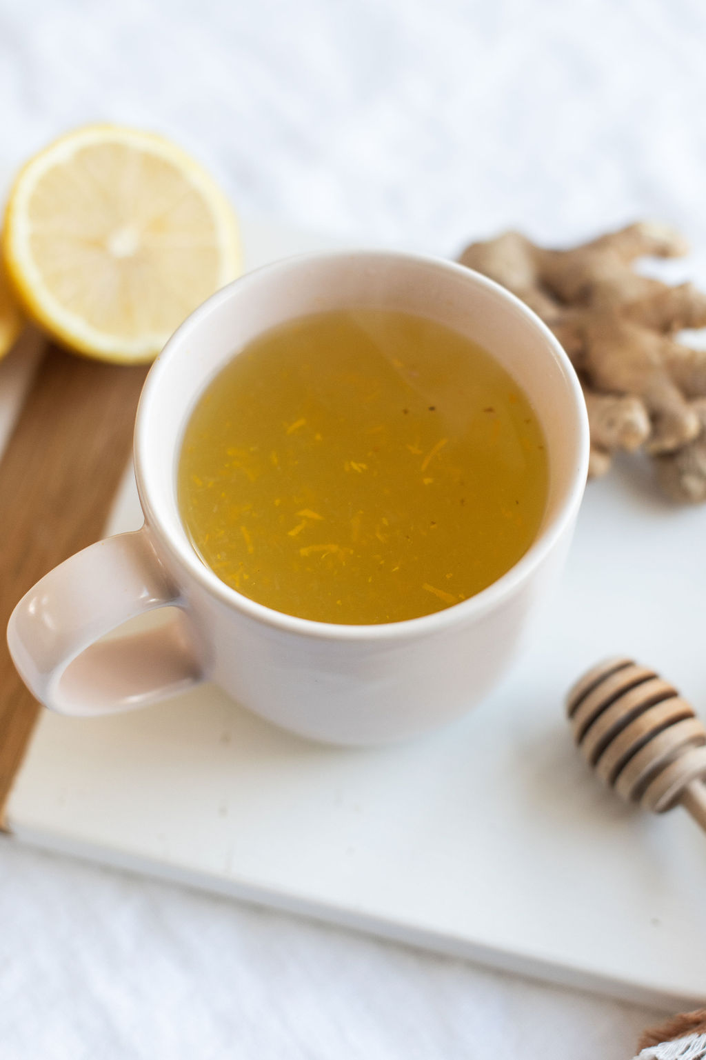 01. Add the hot water and lemon juice into a mug with the freshly sliced ginger and turmeric.