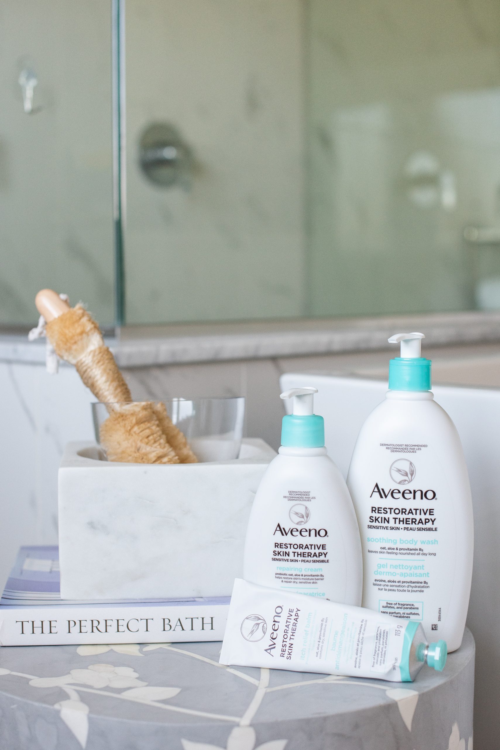 I absolutely love the new Aveeno Restorative Skin Therapy line which includes a soothing body wash, repairing cream and itch relief balm. This formula checks all the boxes, providing a skin nourishing combination of: