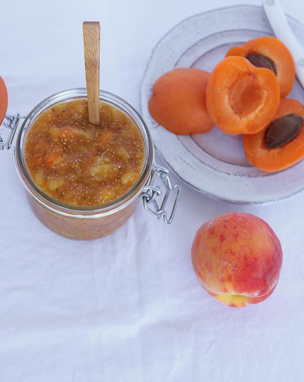 Using a potato masher, mash the fruit mixture in the saucepan. Don’t make the whole mixture into a puree, leave some pieces of the apricot and peach in there.