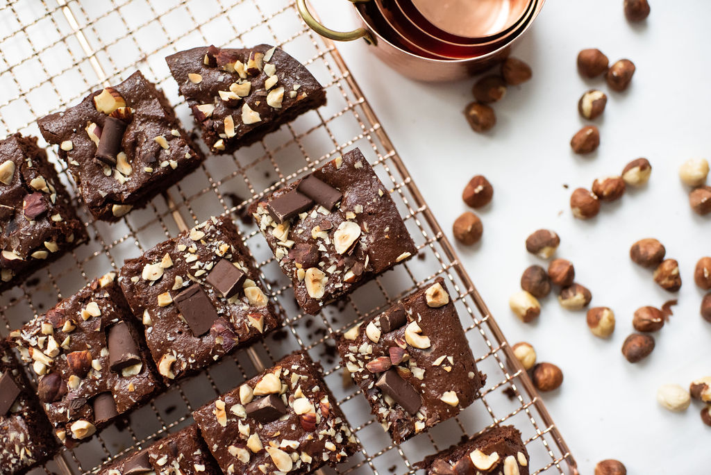 6. 06. Pour into the prepared lined pan and spread evenly. Sprinkle with chopped hazelnuts, chocolate chunks and flaky salt.