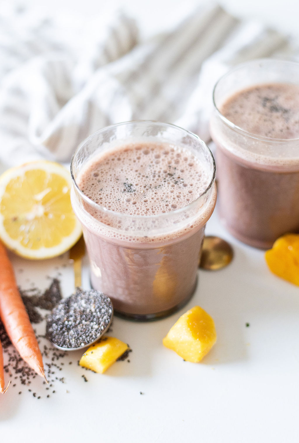 I used a couple of blood oranges which have this beautiful purple color; how fun. Feel free to add your favorite protein, collagen, or any other boosters you enjoy!