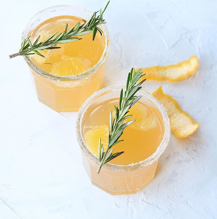 - Divide the infused orange juice between the 4 cups. Top with soda water and garnish with a sprig of rosemary.