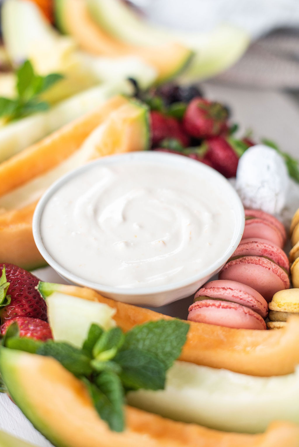 Who doesn’t love to dip?! It just makes food taste even better and is FUN. Normally we do veg dip around here in order to get the kids to eat more raw veg, but a sweet version for fruit is also such a delicious and healthy treat. I love the idea of layering up a sweet dessert board with your favourite fruit, desserts, cookies, nuts, seeds and bowls of gooey melted chocolate and this simple, healthy, creamy and delicious fruit dip!