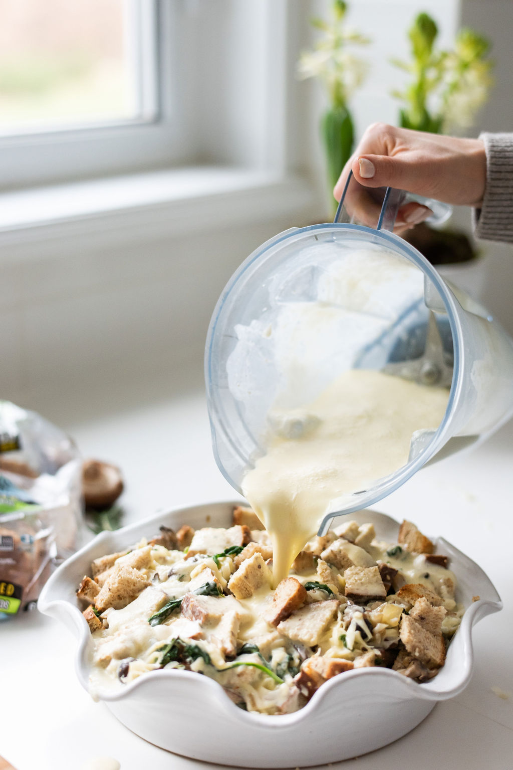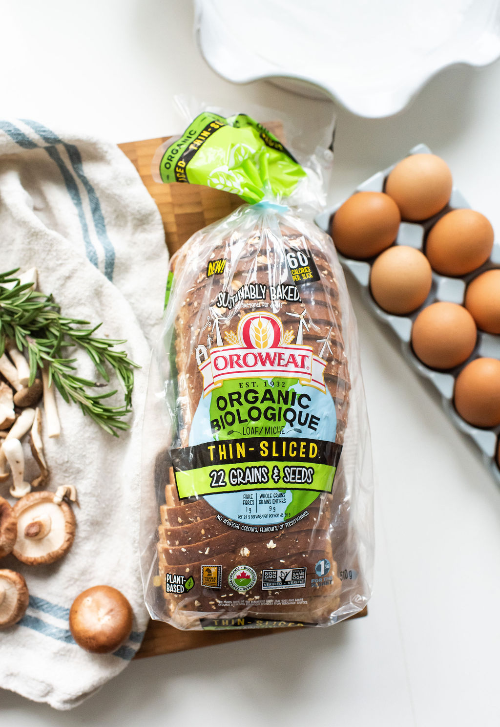 The most important ingredient of my Spinach Mushroom Egg Strata is the bread and I’m using Oroweat Canada’s 22 Grain and Seeds Thin Sliced bread as it really checks all the boxes: plant-based, GMO-free and sustainably baked locally (in Langley, B.C.) with a reduced carbon footprint. As we move deeper into 2022, I think it’s super important whenever or however we can to make subtle swaps that are both good for us and our environment, and it’s easy to do right at home in the kitchen! In this recipe alone I was able to keep it low waste, shopped local and organically, while making a one pot meal that works for the whole fam.