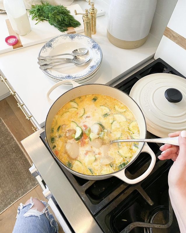 For me it most definitely does! I love to cook according to the season by taking advantage of all the local, fresh ingredients that are available with each passing month. Summer fare is most definitely my favorite. But when the weather is cool and rainy, yet I don’t quite feel like chilli or curry, a beautiful pot of summer chowder will for sure win your over!