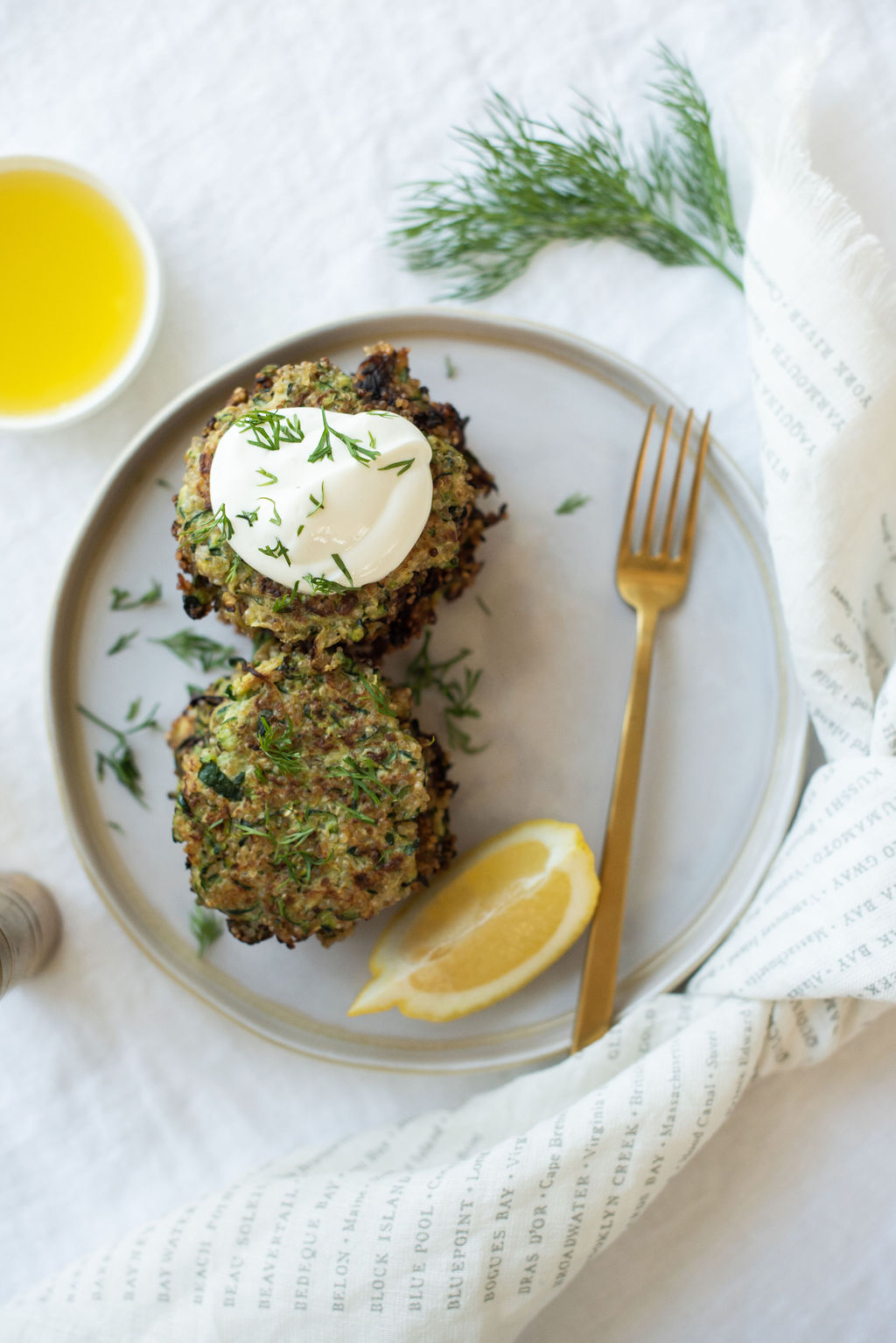 05. Place all the fritters in a platter and garnish with fresh dill. Serve hot with a side of Greek yogurt.